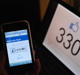 見た目は、Facebookの「いいね!ボタン」のパロディですが、専用モバイルサイトの「いいね!ボタン」を押すと、どこからかいい声で「いいね!」と鳴り響き、舞台側にある「いいね!カウンター」の数字がカウントアップします。